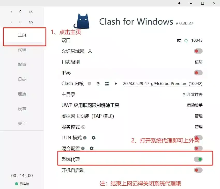 点击主页,打开系统代理模式。