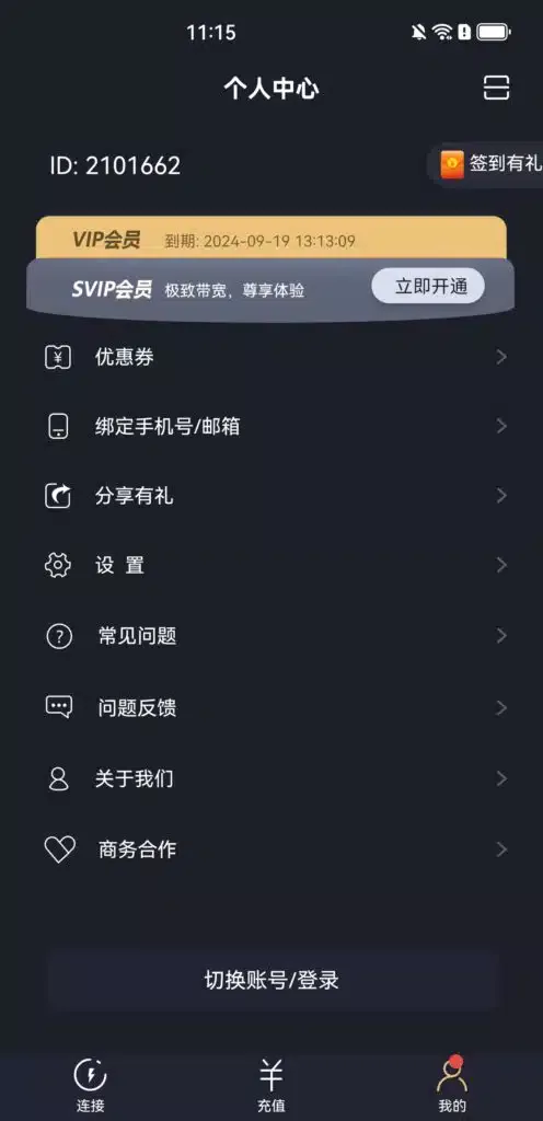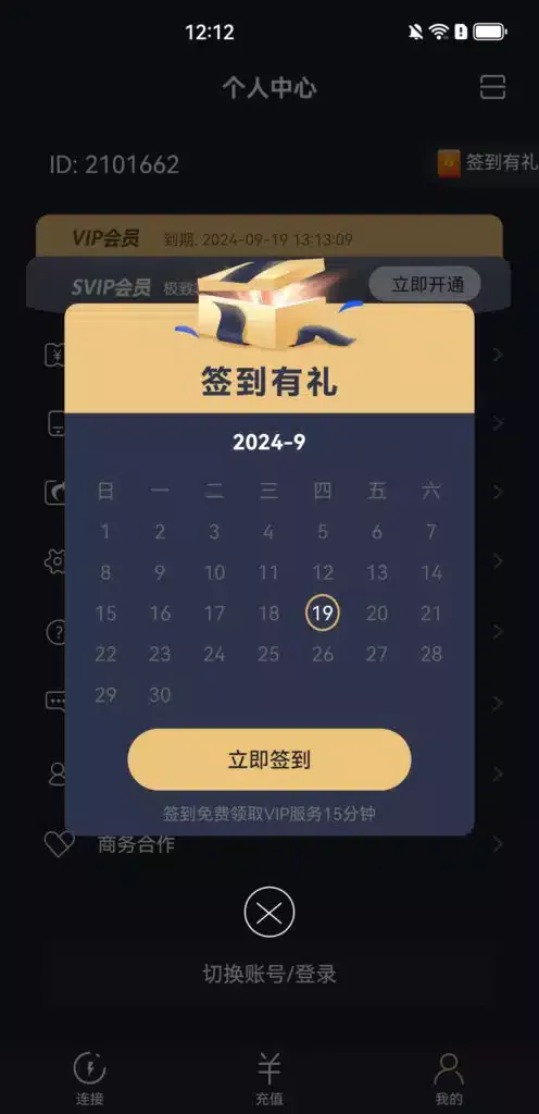 海鸥加速器提供免费试用机会,对于首次进入该应用的新用户,可免费试用2小时 VIP 服务,每日通过点击签到,获取15分钟的免费体验时长,到期时间可在应用内个人中心处进行查看。