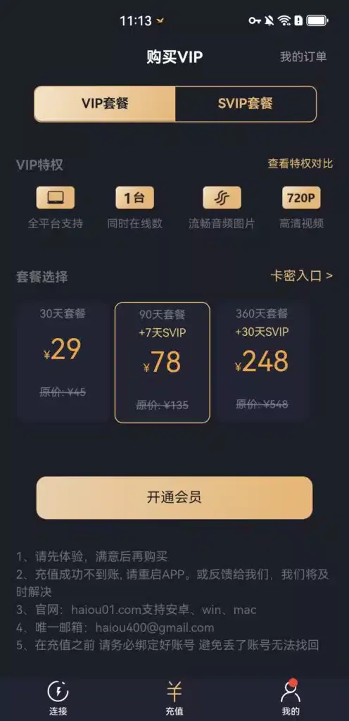 VIP 的价格基本与加速器市场的平均水平相符,购买时间越长,享受的折扣也越大,直接选择年套餐显然是最划算的选择。而 SVIP 套餐的价格则相对较高,并且没有任何优惠活动,建议大家根据自身情况谨慎选择。