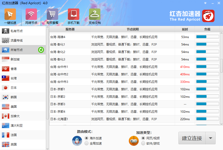 首先在红杏加速器的使用界面内,我们就可以轻松的查看到它的可用节点(具体节点列表我们会在后文内进行分析),在其表格内,可以看到它的延时情况,很明显,红杏加速器不同线路节点之间网速差异还是非常大的,网速较快的线路,延时只有53ms,网速较慢的线路,则可以达到410ms。