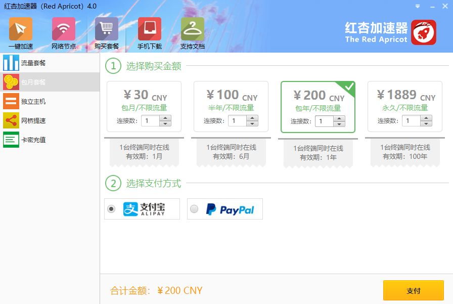 单从价格层面分析,首先是包月套餐,月会员30元,年会员200元,是非常常见的价格设置,属于中规中矩的范畴,市面上很多加速器都采取了这样的定价,例如猎豹加速器,那么同样的价格,在不同的加速器里却可以获取到不同的服务,这也就是大家所关注的性价比问题,同样是30元,红杏加速器的性价比显然远远不及其他选择。