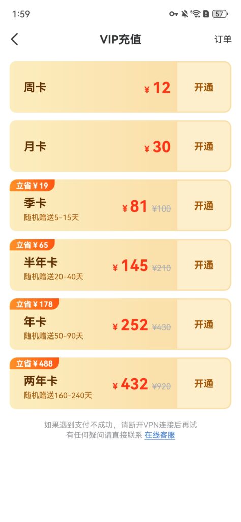 除以上两种方式之外,飞鸟加速器不再提供额外的免费获取渠道。用户如果想要长期稳定的使用飞鸟加速器,就需要考虑购买其付费 VIP 服务。飞鸟加速器所能提供的会员套餐还是非常全面的,包括周卡、月卡、季卡、半年卡、年卡、两年卡六种,其中各个套餐的定价以及优惠措施都有明显标注,具体如下图所示: