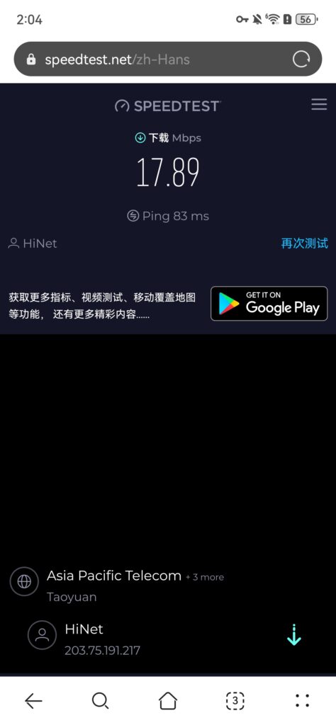 测试网速下载速度 17.89 Mbps,Ping 值 83 ms