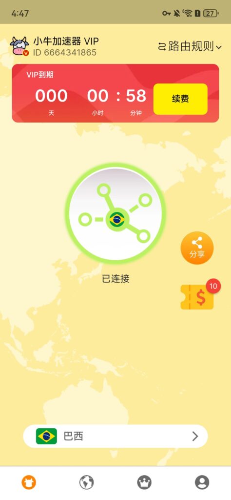 小牛加速器采用的是常见的一键连接模式,用户点击主页内的圆圈按钮即可开启连接,再次点击即为断开。