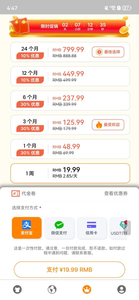 最后,如果用户仍然要购买小牛加速器的服务,可以直接在应用内进行付款,小牛加速器支持支付宝、微信、信用卡、以及 USDT 付款,整体上还是很便捷的。