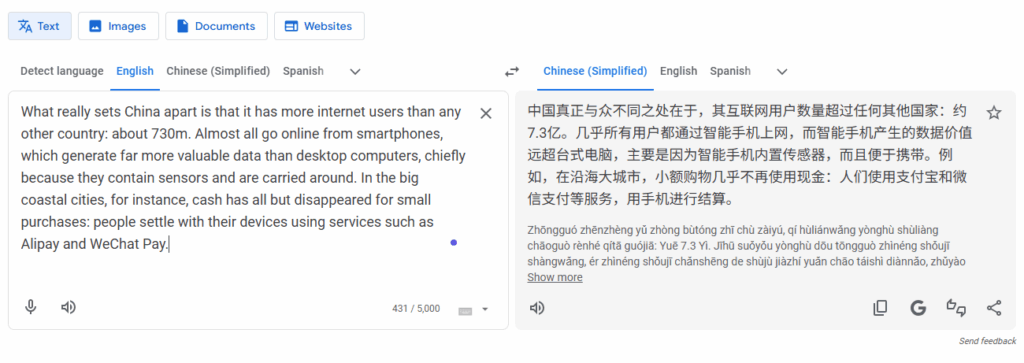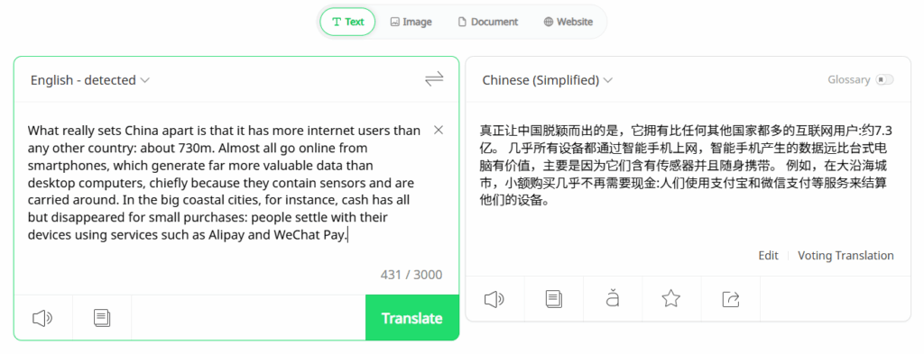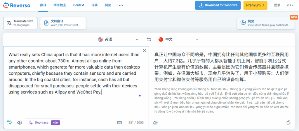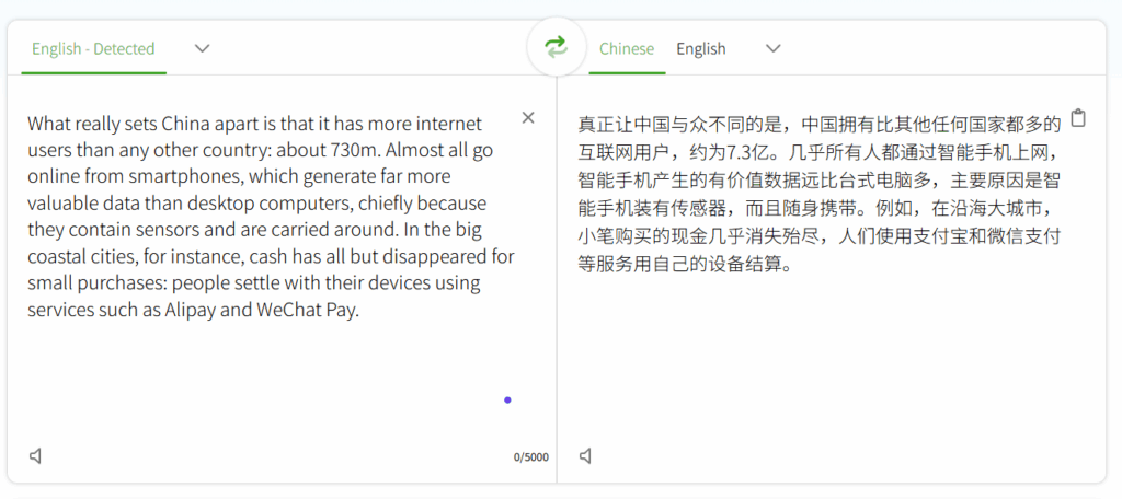 为了让大家更为清晰的观察并对比到这些 AI 工具的差异,我们会在测试中统一让它们翻译以下文本内容,你可以自行判断谁的翻译效果更好:What really sets China apart is that it has more internet users than any other country: about 730m. Almost all go online from smartphones, which generate far more valuable data than desktop computers, chiefly because they contain sensors and are carried around. In the big coastal cities, for instance, cash has all but disappeared for small purchases: people settle with their devices using services such as Alipay and WeChat Pay.