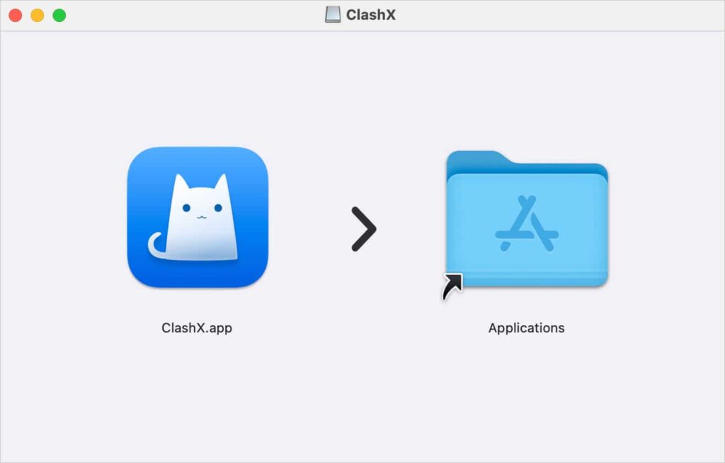 .dmg安装包。 - 打开下载的文件,将 ClashX 拖入应用程序文件夹。