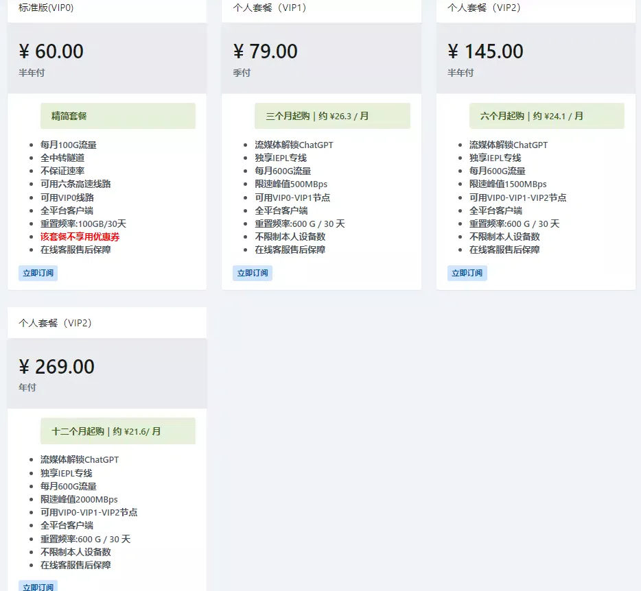 灯塔机场后续三个套餐即为正常的会员服务,季会员79元,半年会员145元,年会员269元,用户每月可享受 600G 流量,享受 IEPL 专线服务,享受全部线路节点,不限任何设备数。