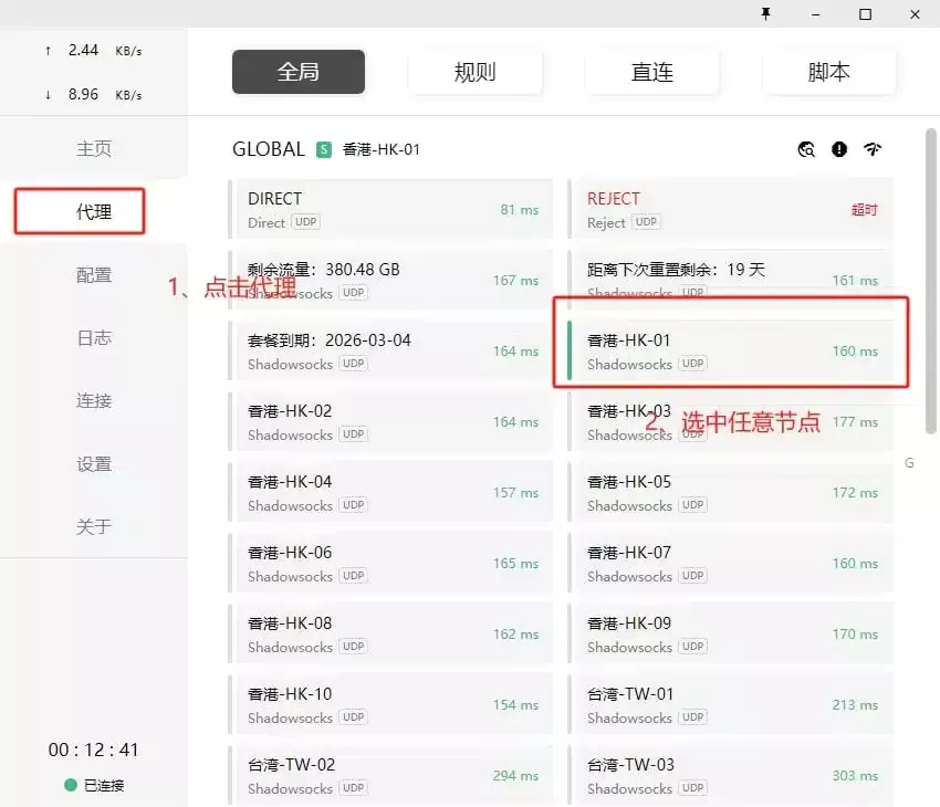 去到代理选项,选择全局代理模式然后手动选择任意一个节点进行连接: