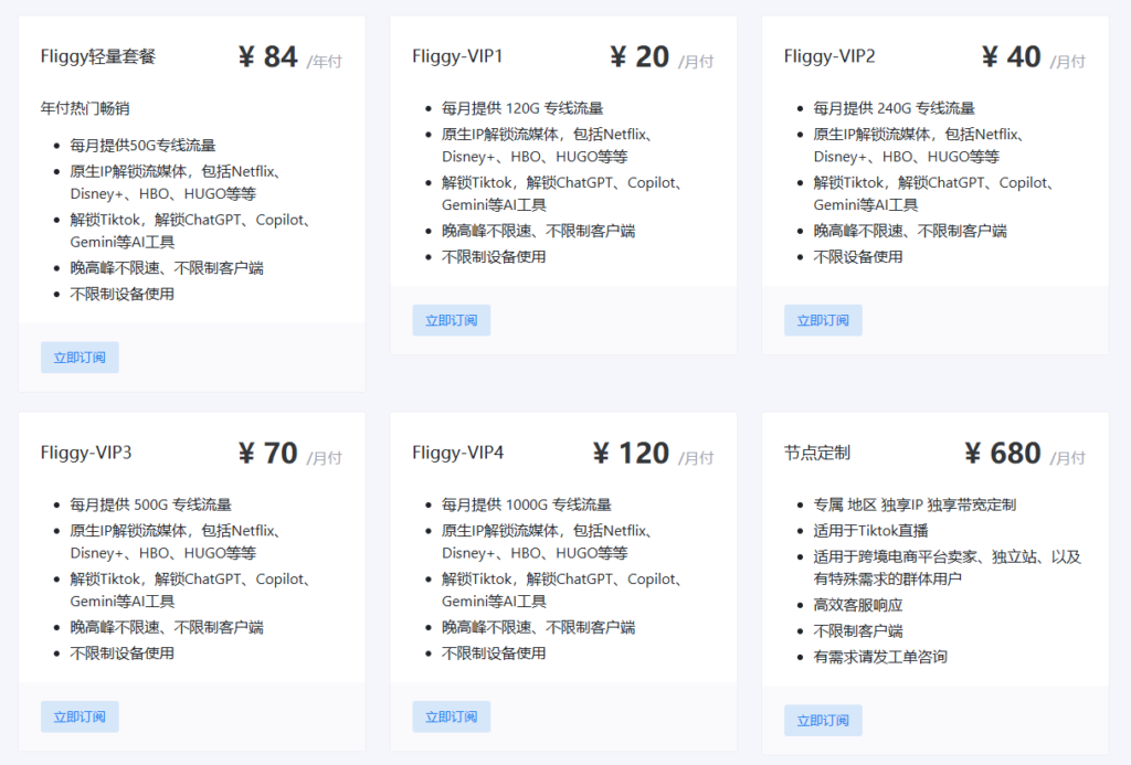 首先第一种,可以视作为一个体验套餐,用户仅需直接支付84元即可开通一年会员服务,每月可享受 50G 流量,无限速,支持解锁 Tiktok、Disney+、以及 ChatGPT、Copilot、Gemini 等 AI 工具。