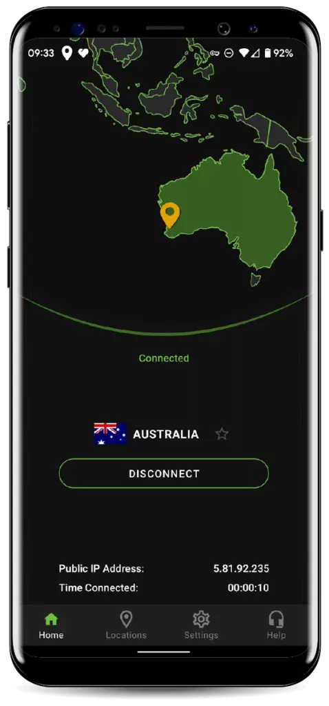 如果你有切换服务器节点的需求,只需要点击图上【AUSTRALIA】处,就可以展开所有备选的服务器节点列表,选择你要连接的地区,即切换成功。
