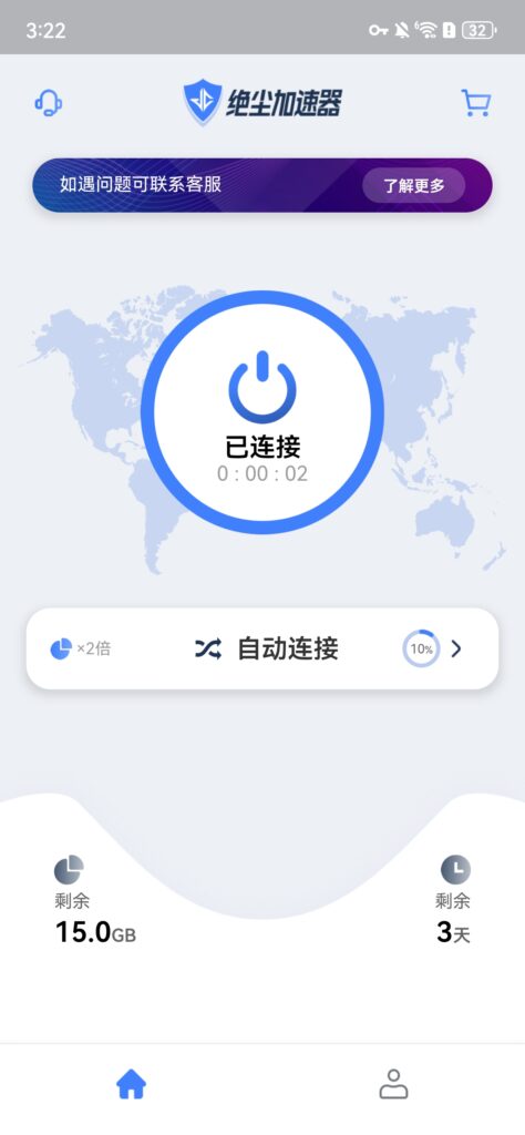 绝尘加速器为用户提供了免费试用机会,新用户可获取15G的免费流量,限3天内使用。流量用完或3天时间到期,则免费试用停止。
