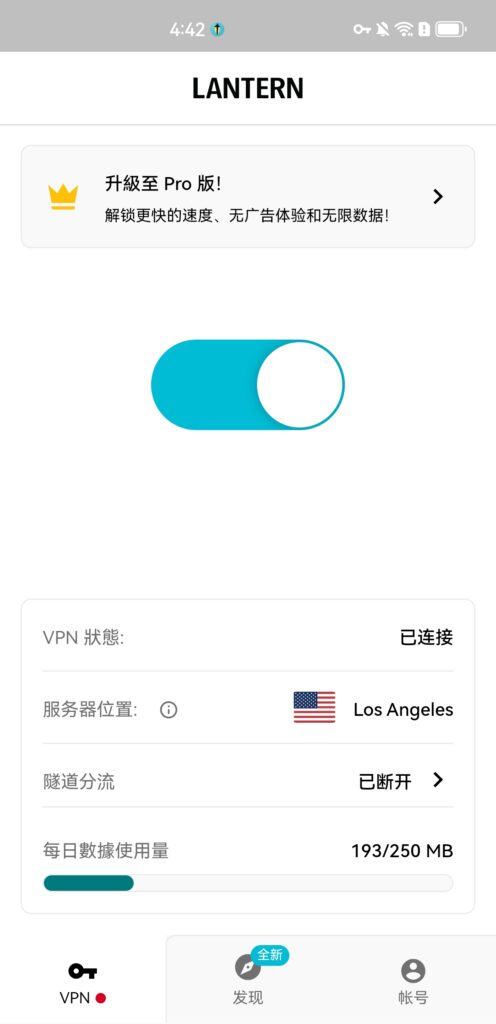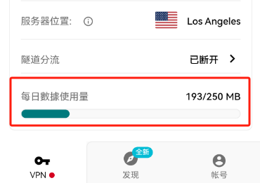 首先,蓝灯加速器可以提供一定程度的免费试用,如图所示,用户每天有250M的可用流量,当然,这个流量额度非常少,且不说什么玩游戏看视频,哪怕只是看网页,这个流量很快就会被消耗殆尽,用户可能在非常短的时间内就会遭受到流量不足的困扰,无法继续进行上网活动。