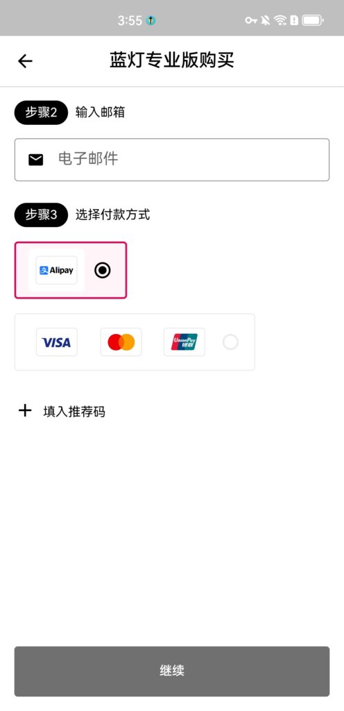 蓝灯加速器的付费渠道这里我们也介绍一下,虽然蓝灯加速器的免费使用无需注册,但付费时,需要绑定一个邮箱账号,等同于注册,付款方式包括支付宝、VISA 等等。