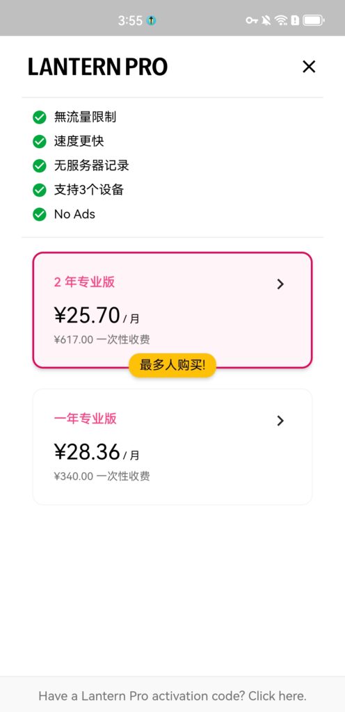 那么在免费流量之外,如若你仍然想使用蓝灯加速器的服务,就需要付费购买其会员。蓝灯加速器的会员分为两种,1年会员与2年会员。付费会员可享受不限流量、速度更快、无服务器记录、支持三台设备、无广告的服务。具体价格如图所示: