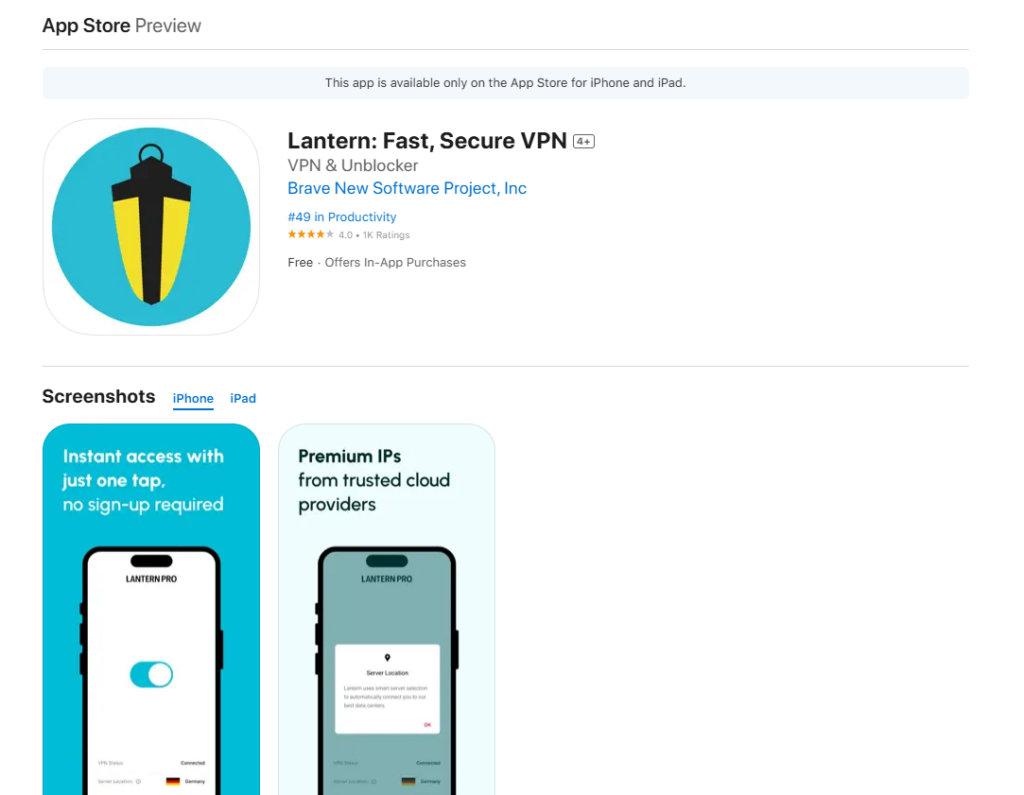 苹果下载:点击【iOS】按钮,即可跳转到苹果下载页面,此时系统会显示,需要跳转到 APP Store 中进行下载。鉴于加速器的特殊性,要想实现苹果端的下载成功,你就需要更换苹果 ID 为美区 ID,或直接购买一个美区ID进行使用,此流程相对比较复杂。