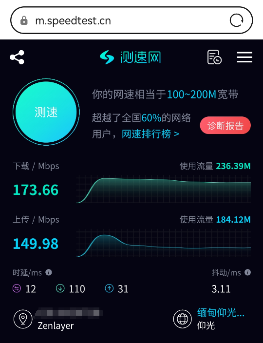为了获取蓝灯加速器的网速,我们对其进行了速度测试,获取的网速数据如下: