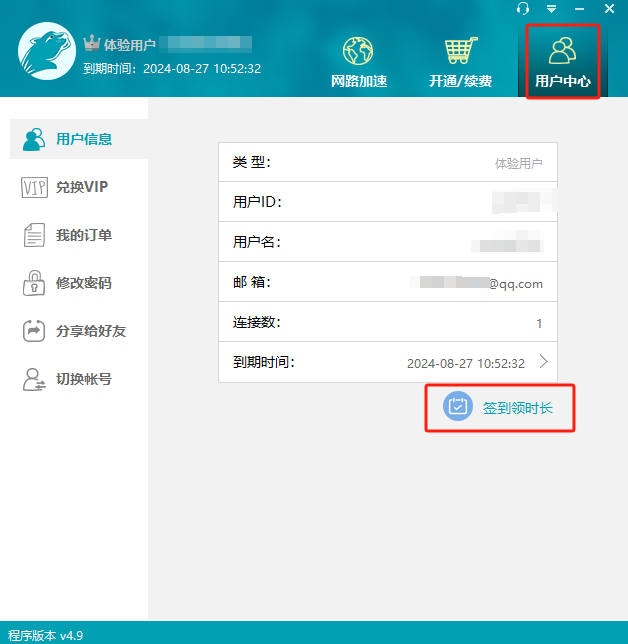 无论是在手机移动端还是电脑端,你都可以轻松在应用界面内找到签到按钮,手机端在首页内点击左上角【签到】即可;电脑端则需要点击上方【用户中心】-【签到领时长】,通过点击签到即可获得1小时不限流量的免费体验机会,终身有效。