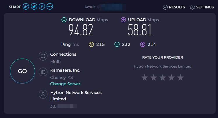 测试网速 | 下载速度 94.82 Mbps,上传速度 58.81 Mbps |