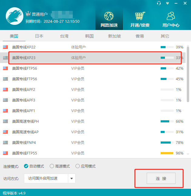 电脑端用户,在启动加速器之后,只需要先选择任意一条线路,再点击右下角连接按钮,即可连接成功: