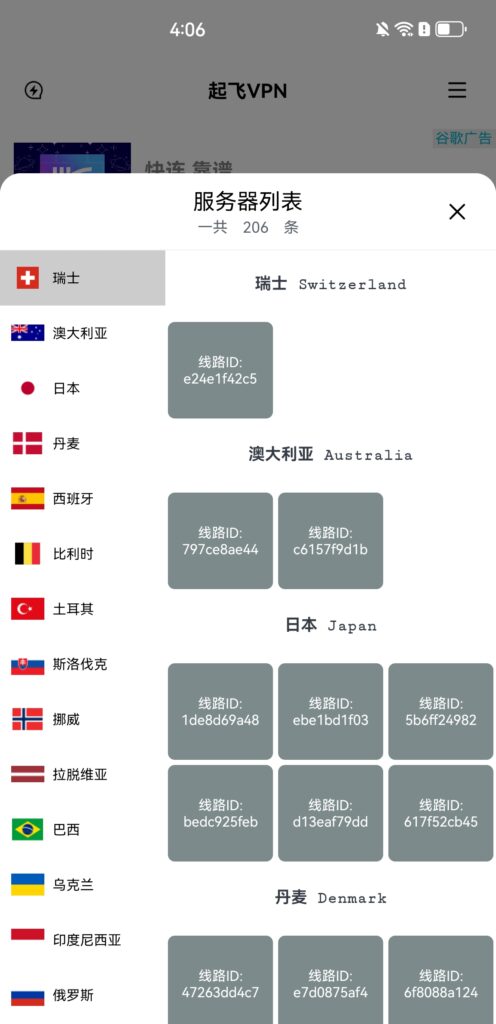 首先,你需要点击【选择服务器】,在服务器列表内选择任意一条你想连接的线路,例如我们图上选择了瑞士: