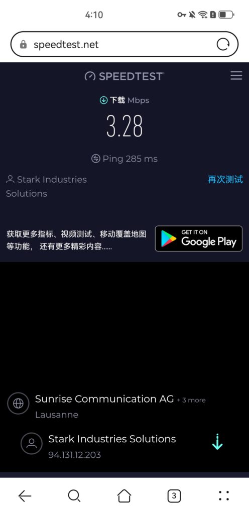 下载速度:3.28 Mbps,Ping 值:285 ms。