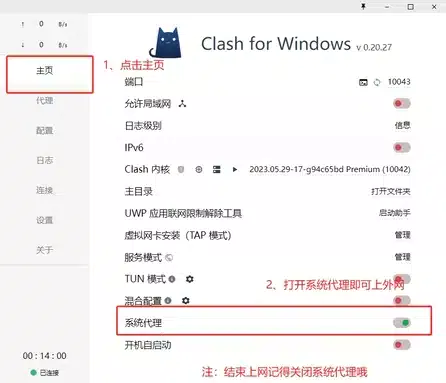 再去到【设置】选项,打开系统代理模式,一切就绪。
