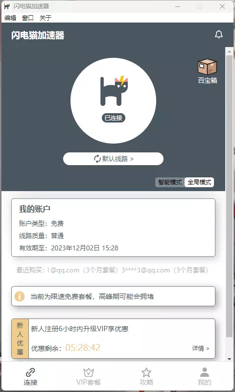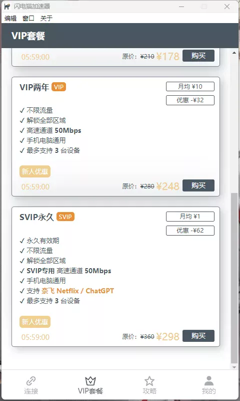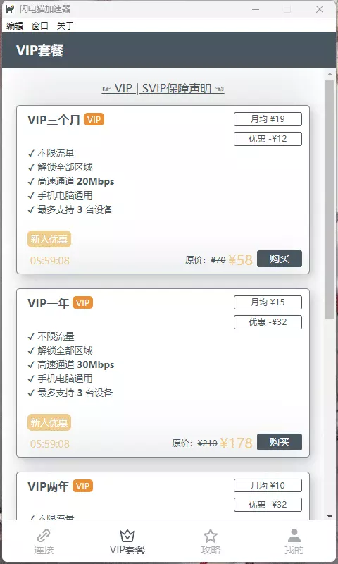 免费试用期结束后,你需要购买闪电猫加速器的付费会员服务。价格分为两种,其一,是在新人注册后6小时之内就开通 VIP,享新人优惠价(系统会显示优惠剩余时间);其二,就是在6小时之后开通,原价购买。
