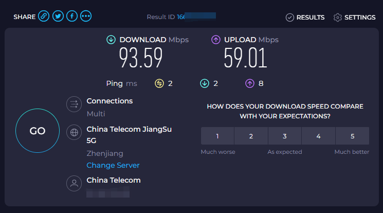 上传速度(93.59 Mbps)明显高于下载速度(59.01 Mbps),这表明该网络可能更适合需要大量数据上传的应用场景,如云存储、视频会议和在线备份等。