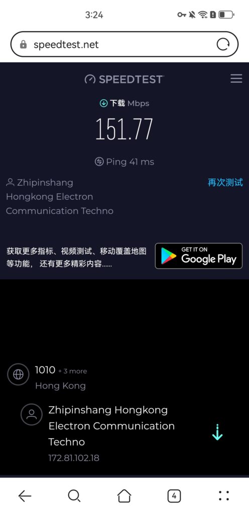 | 测试网速 | 下载速度 151.77 Mbps,Ping 41 ms |