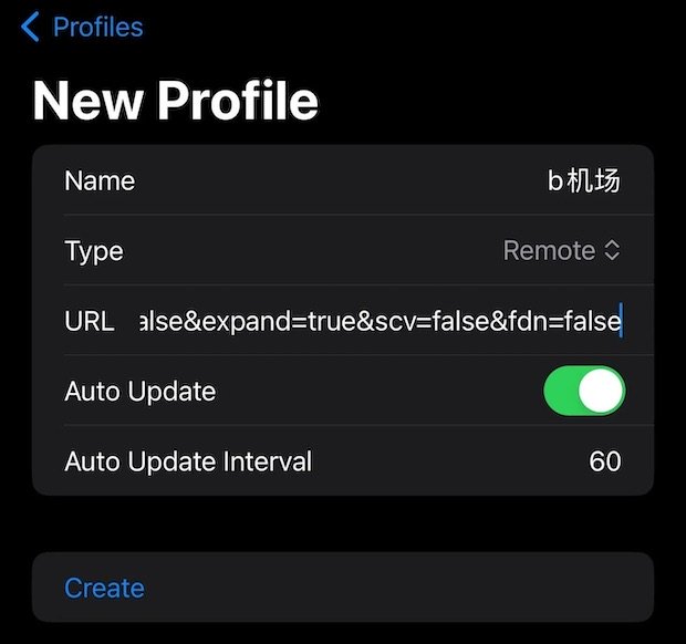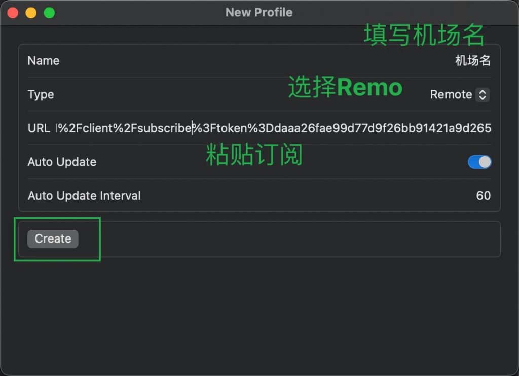 填写订阅名称,类型选择 remote,输入订阅链接,然后点击 create 创建: