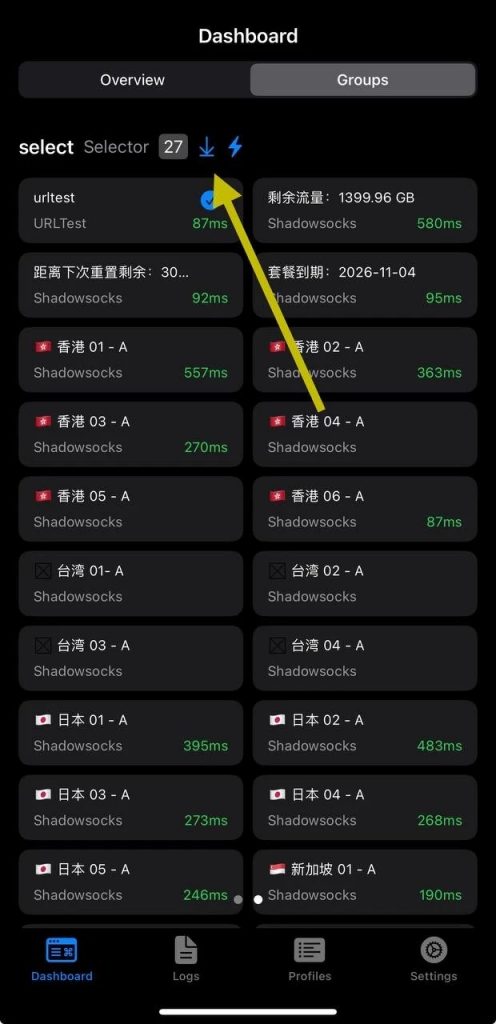 点击 Groups,可以点击闪电按钮进行测速,然后选择合适的节点开始使用: