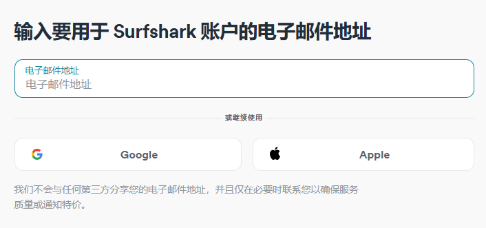 首先,Surfshark 加速器需要用户注册个人账号,你可以通过 Google、Apple 快捷登录,也可以通过海外电子邮箱进行注册。显然,这套注册流程对国内用户是并不友好的,如果以上的注册条件你都无法具备,那么我们还是更推荐你使用国内的加速器工具,例如猎豹加速器、啊哈加速器,它们只需要使用国内 QQ 邮箱即可注册,有些甚至完全免注册。