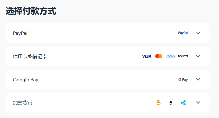 最后,Surfshark 加速器的付款方式包括图上几种,信用卡、借记卡、Google Pay、PayPal、加密货币,无法支持我们国内用户常用的便捷付款 APP。如果以下付款方式都没有你能用的,那么还是推荐你使用我们国内的加速器,例如啊哈加速器,通过支付宝即可付款。