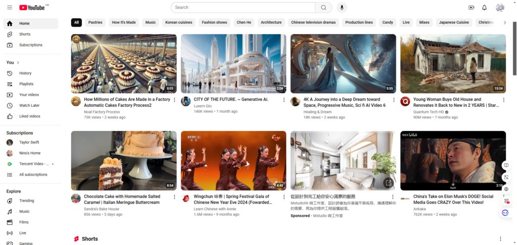 为了最直观的获取到无忧加速器的网速表现,我们还对 YouTube 的网页加载、视频播放来进行了测试。首先我们连接好加速器,对 YouTube 官方进行访问,可以看到 YouTube 的首页加载速度非常快,基本打开网页就能看到所有视频的缩略图预览。