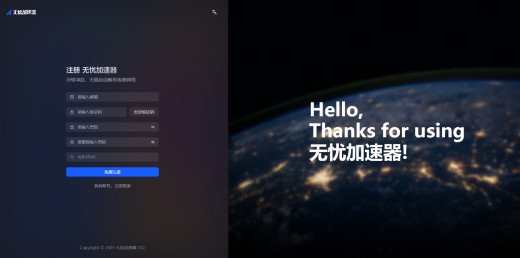 无忧加速器可支持各个端口的使用,包括 Android、iOS、Windows、MacOS,点击下方按钮即可跳转到官网。无忧加速器要求新用户注册登录后使用,你需要在官网内填写电子邮箱账号、输入验证码、密码、二次验证密码,并点击免费注册。