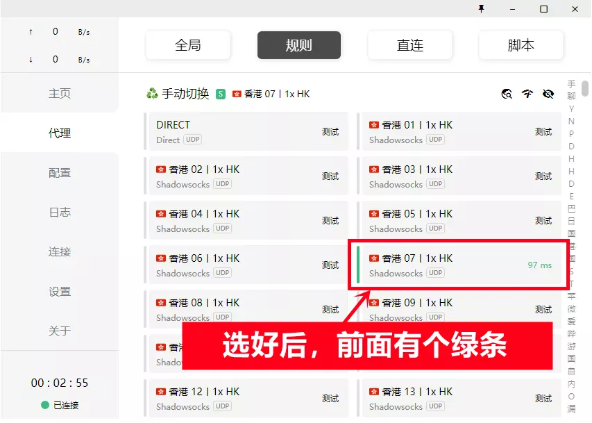 打开 Clash for Windows,从侧边栏进入【代理(Proxies)】,点击选择【规则(Rule)】然后在下方的节点列表中选择你中意的节点,点击进行连接。