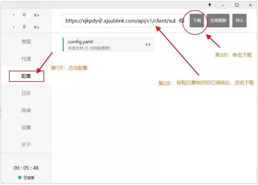 第三步:回到 Clash ,点击左边位置的【配置】,粘贴已复制好的订阅地址,最后点击【下载】:
