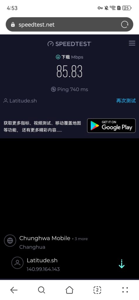 测试网速 | 下载速度 85.83 Mbps,Ping 740 ms |