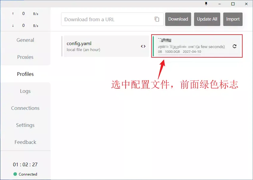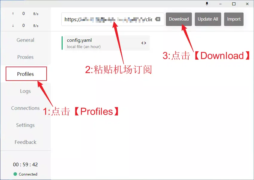 打开 Clash For Windows,找到【Profiles】,粘贴刚才从机场复制的订阅链接,然后点击【Download】。