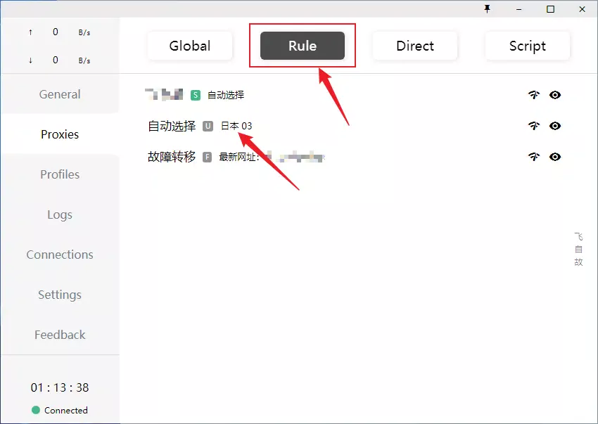 如下图所示,Clashnews 选择用【规则模式】下【自动选择】,Clash 给自动分配了目前延迟最低的【日本03】节点: