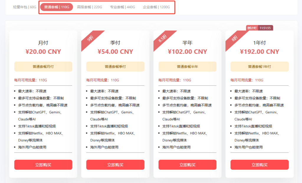 另外四种套餐则为常见的套餐服务,用户可以根据自己的流量需求来选择合适的套餐,在购买季、半年、年会员时,每个套餐都同样享受折扣优惠。