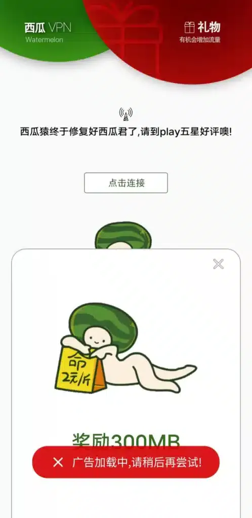 在使用西瓜加速器时,如果觉得流量不够用,可以通过观看广告的方式获取额外的 300M 免费流量。只需点击主页右上角的【礼物】图标即可开始观看广告。然而,如图所示,广告的加载并不总是顺畅,能否成功观看也需要一些运气。如果广告无法顺利加载,那么你自然无法获得这额外的 300M 流量。