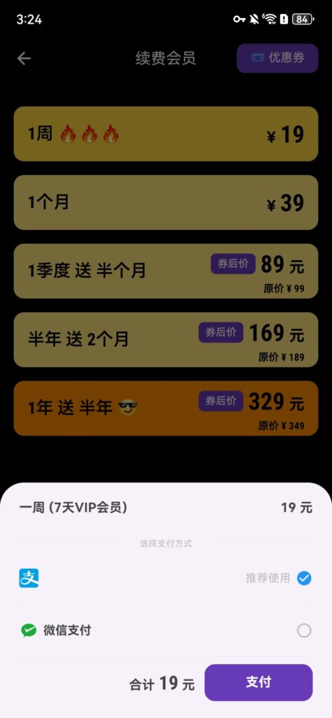最后,如果你有意购买夜猫加速器,那么可直接在应用内进行付款,夜猫支持支付宝、微信付款,方便便捷。