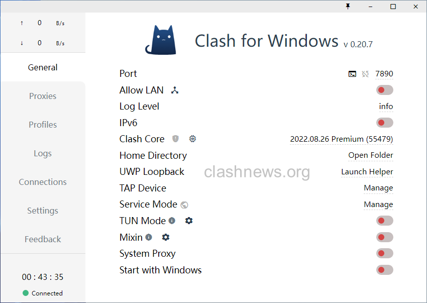 首先在后台内,下载安装好 Clash For Windows,打开后默认界面如下图所示: