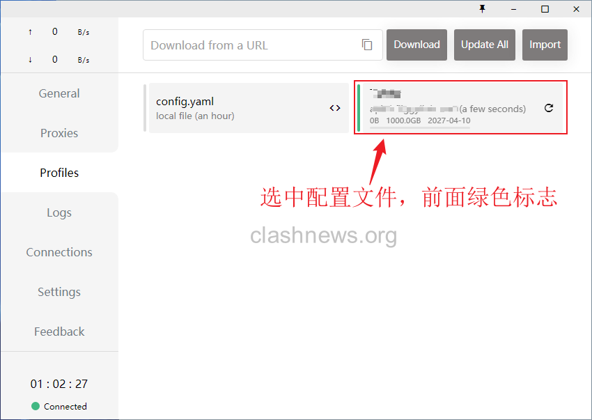 打开 Clash For Windows-【Profiles】,粘贴刚才从机场复制的订阅链接,然后点击【Download】: