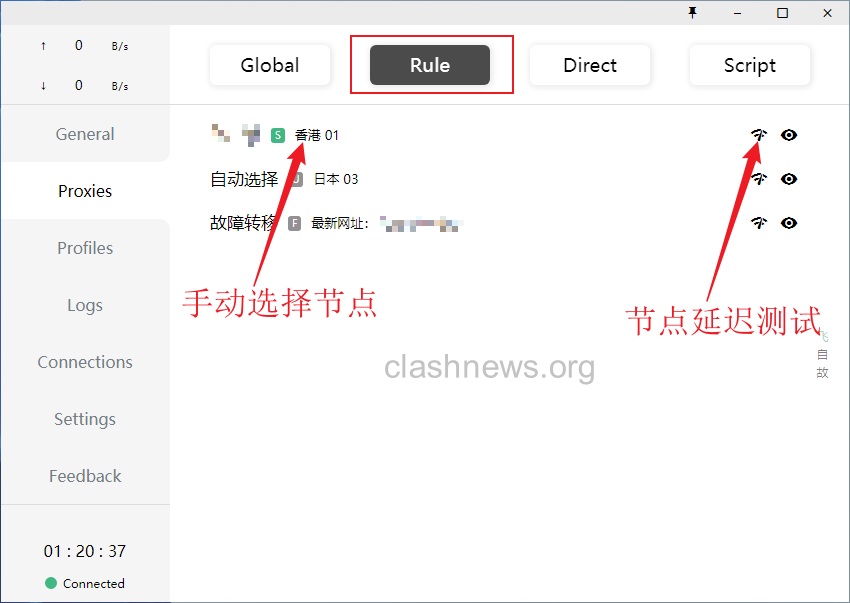 你也可以选择用【规则模式】下的【手动选择】,如下图所示,我们选择了【香港01】作为我们的代理节点: