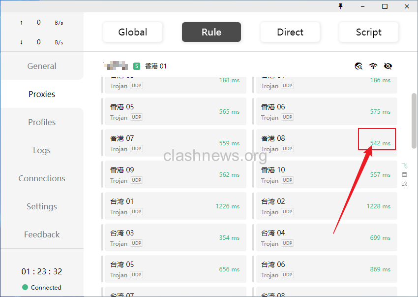 在我们点击过延迟测试按钮后,每个节点后面应该都有一个绿色的数字,表示当前机场节点可用,如果显示【timeout】表示当前机场节点不可用: