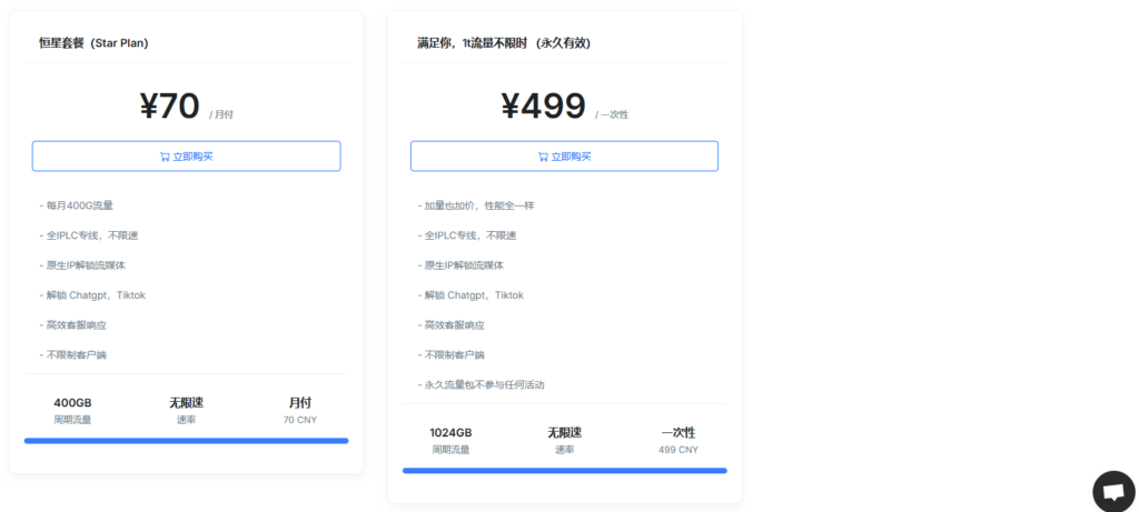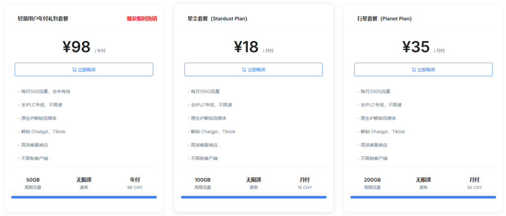 首先第一种,可以视作为一个体验套餐,用户仅需直接支付98元即可开通一年会员服务,每月可享受 50G 流量,无限速,支持解锁 Chatgpt,Tik Tok。