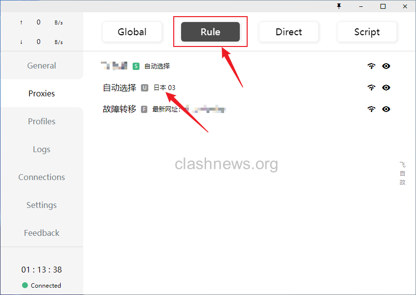 你可以选择用【规则模式】下【自动选择】,如下图所示,Clash 给自动分配了目前延迟最低的【日本03】节点: